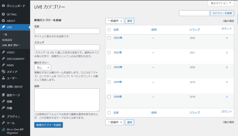 過去のライブ情報はカテゴリーとして開催年を登録することで「LIVE ARCHIVE」から年別に表示することができます。