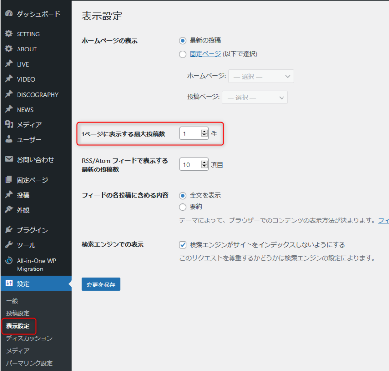 にて「1ページに表示する最大投稿数」を1件にして「変更を保存」してください。(※元から1件になっていても「変更を保存」してください。)