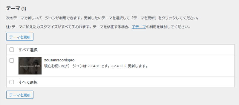 にてご確認いただけます。新しいバージョンがある場合はチェックを入れて「テーマを更新」でアップデートいただけます。