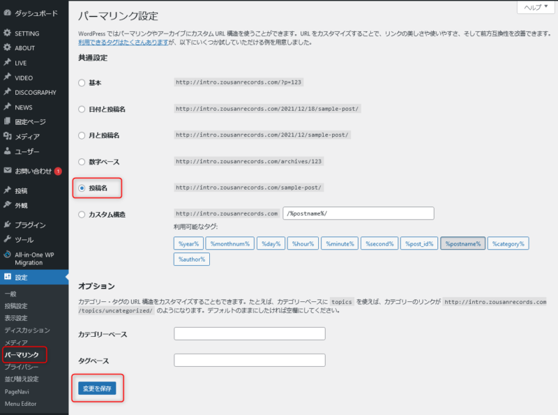 にて「投稿名」にチェックが入っているのを確認して、(何も変更していなくても)「変更を保存」をクリックしてください。