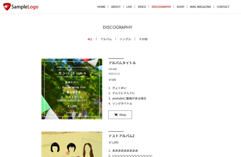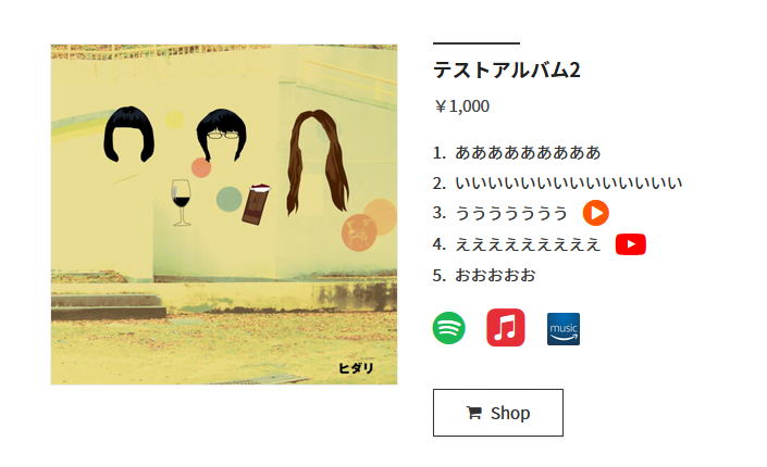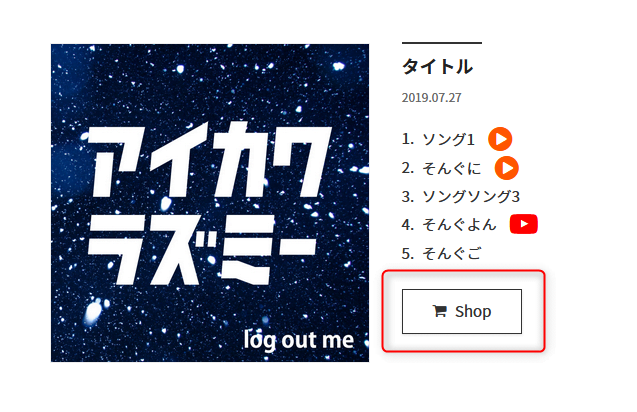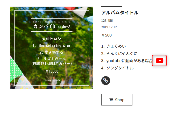音源を販売しているページがある場合、「販売URL」欄にURLを入力することによって「shop」ボタンが表示されリンクが貼られます。