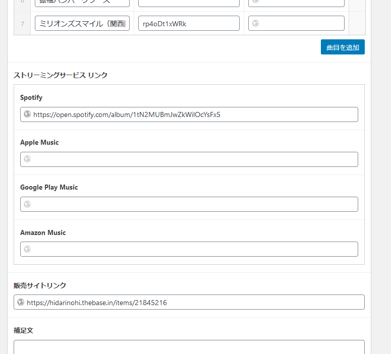 の4つ。DISCOGRAPHYの投稿画面、「ストリーミングサービス リンク」にて任意のURLを入力します。